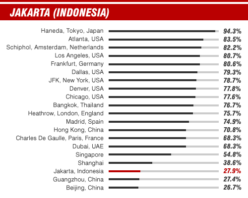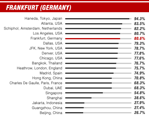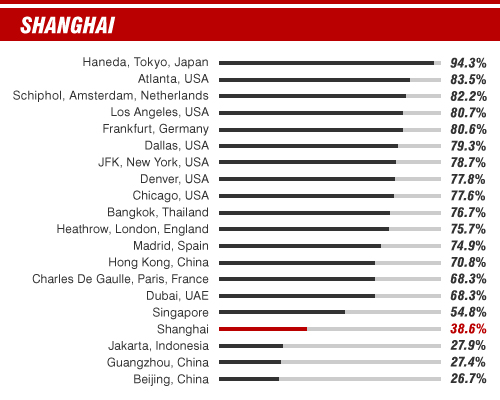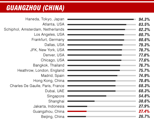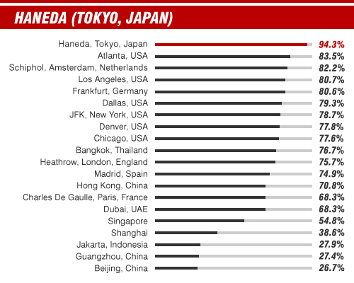 Tokyo's Haneda tops the list with on average 9 out 10 flights departing on time, but don't expect to leave China's main airports on time -- they prop up the list with only 1 out of 4 flights hitting their allotted take-off slot.